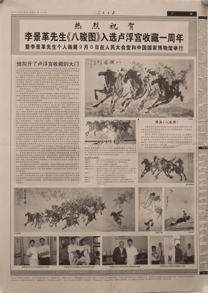《人民日報》熱烈祝賀李景革先生《八駿圖》入選羅浮宮收藏一周年